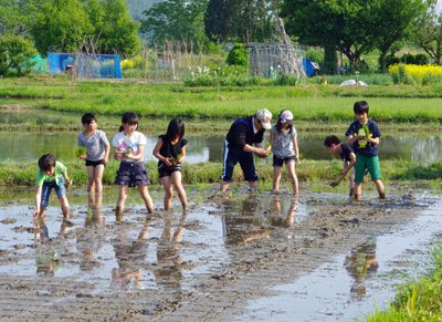 に田植えをする子どもたち。放課後の限られた時間の中での活動ということ