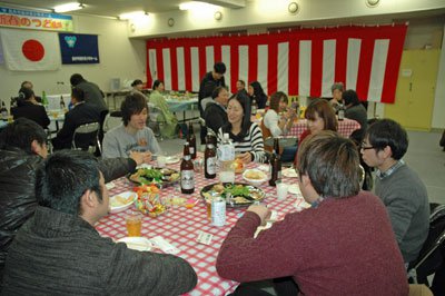 乾杯の声を合図にパーティーがスタート。餅つきやビンゴゲーム等を