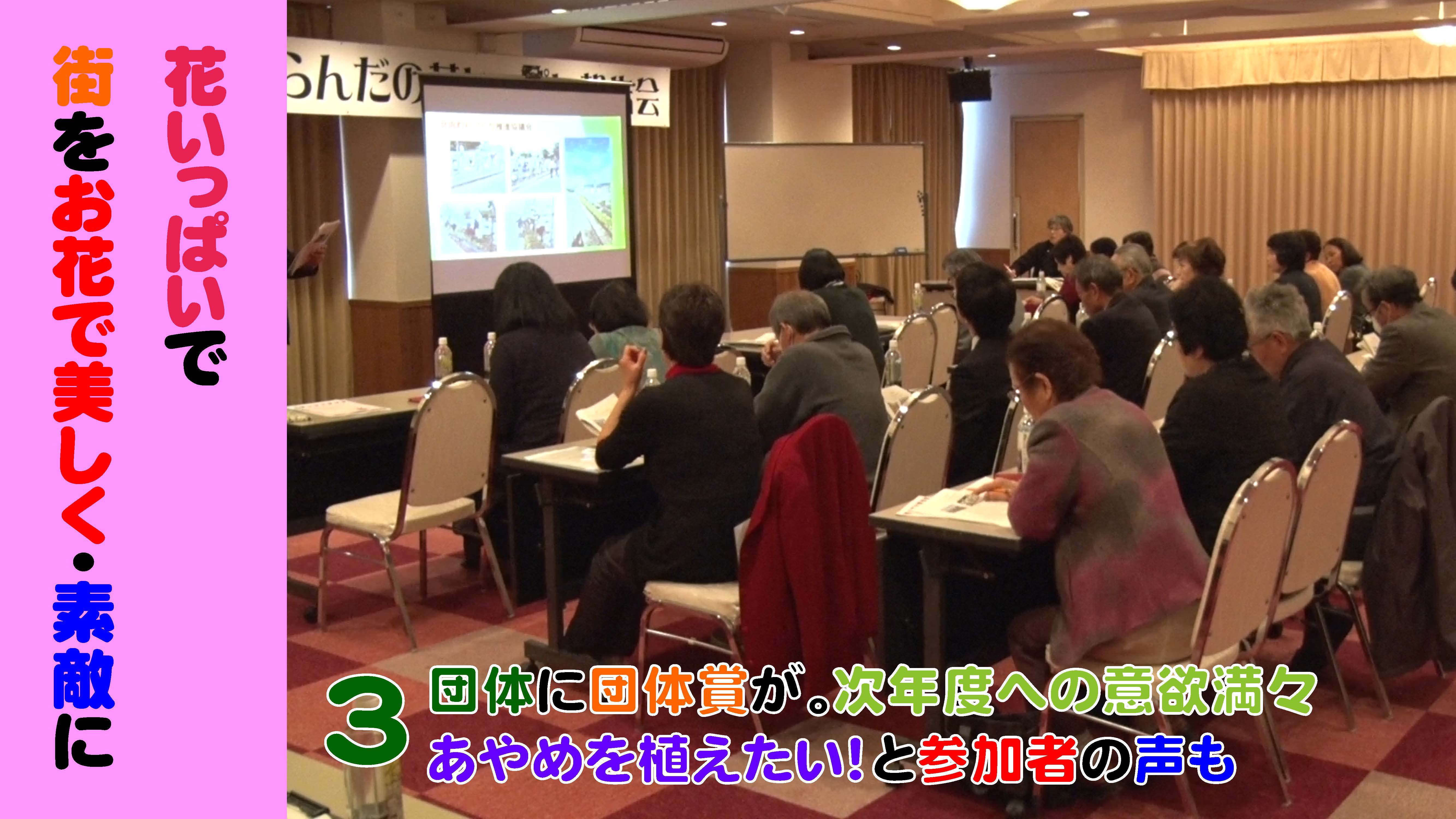 平成30年度おらんだの花いっぱい運動報告会が2月27日、タスで開催されました。「花いっぱい運動」は、花のまち長井の主に道路沿いなどを花できれいに美しく彩り、観光などで長井に訪れる皆さんをお出迎えしようとするもので、各地域の皆さんが毎年工夫しながら行っています。今年は、長井市観光協会から団体賞が3団体に贈られました。また、各団体の活動発表のあと、勝山ミツ子先生による花植えのアドバイスとミニ講演会が行われ、参加者は次年度に向けた意欲をかきたてていました。