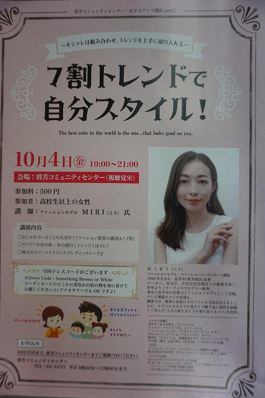 致芳地区出身のファッションモデルであるMIRI氏を講師に迎え、高校生以上の方を対象に、トレンドの上手な取り入れ方などを御講演いただきます。