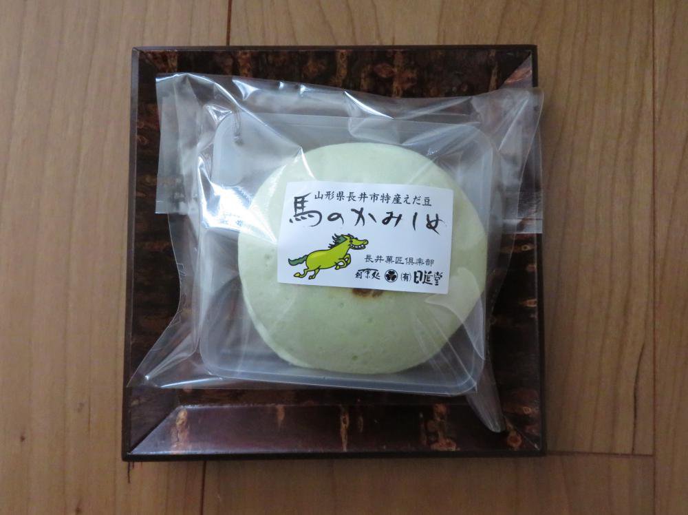 【駅茶で一服】「馬のかみしめ」は長井の伝統作物の枝豆の名称です。菓子のパッケージを開けると枝豆の香りが広がる銘菓です。どうぞご賞味ください。