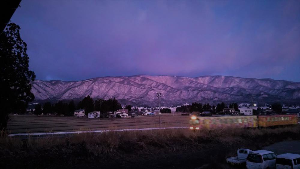 きれいな朝焼け。葉山の山並みがピンク色に染まっていました。地元の歌人 大道寺吉次の句を思い出した。「起き出でて 葉山の峰を眺むれば 恥じらふ色に雪を染めたり」夕陽に輝やく葉山は、父にも似て圧倒されるほどに神々しい。朝陽に浮かぶ葉山は、母にも似て優しく艶やかだ。嗚呼、故郷の山は有難きかな。