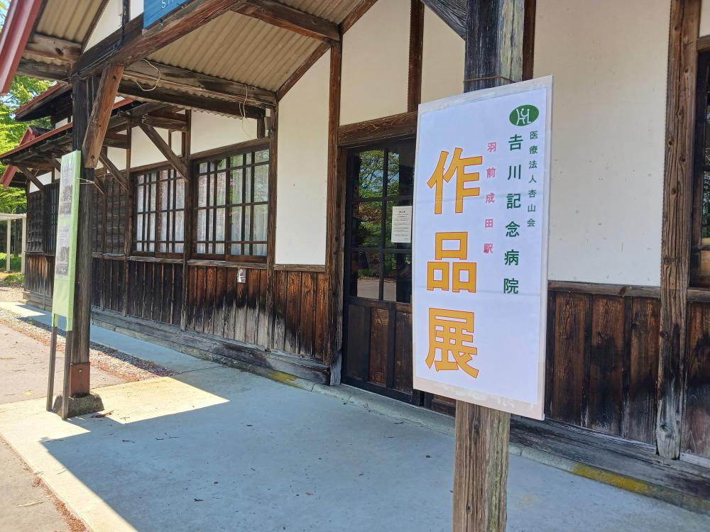 羽前成田駅の待合室では吉川記念病院の作品展が開催されています。2006年(平成18年)11月の開院以来、吉川記念病院とはお互いに協力して事業を実施してきましたが、コロナ禍にあって連携事業は長い間休止していました。今回の展示会などをきっかけに、少しづつ交流の機会がつくられればいいなぁと思います。