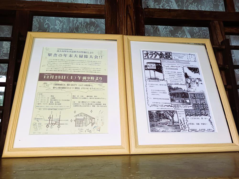 歴史を振り返る時、そこにはターニングポイントともいえる出来事があるものです。両駅でのターニングポイントとして考えられるものが、上の写真にあります。西大塚駅では2010年(平成22年)の年末大掃除の事業案内です。長井まちづくりNPOセンター(当時)が、置賜まちづくり学校として主催したもので、西大塚駅を木造駅舎の聖地にしよう」とあるのが、印象的です。なおその一年前に米屋こうじさんが西大塚駅で写真展を行っていました。