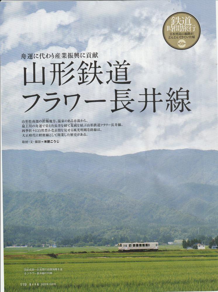 展示されている雑誌の中に、フラワー長井線を紹介した旅の手帳(2022年10月号)がありました。米屋さんが取材し、文と写真を寄稿したものです。記事の内容は最上川舟運時代に遡って地域の歴史を掘り起こし、長井線の開業から第3セクター誕生までの歩みを説明しています。そこで驚いたのは、沿線各市町の市町史を調べて引用している点です。作品をまとめる時に、対象となるものについてその背景を調べる、つかみ取ろうとする米屋さんの姿勢が見えたような気がしました。