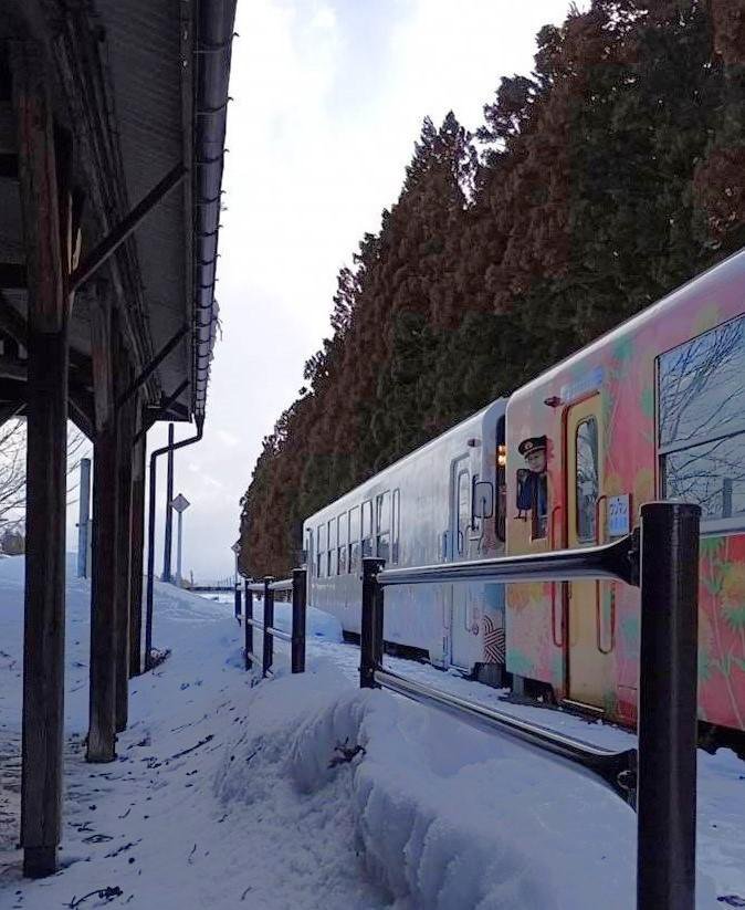 時間になると列車はホームに到着する。車掌さんは吹雪の時でも顔を出して安全を確認する。当たり前の光景だけど、有難いものだと思う。(写真は昨年2月の羽前成田駅:M.Nさん提供)